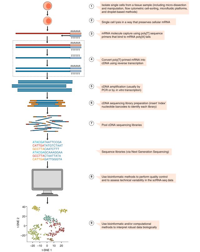 理論上說,任何的真核細胞都可以進行scRNA-seq檢測。但在實際操作過程中,需要注意的是:1)從組織(特別是實體組織)中獲得細胞的數量和活性;2) 在獲取過程中人為操作對細胞轉錄組的影響,以避免出現人為因素的轉錄表達變化。當然從技術上說,除了分離單個細胞進行檢測外,還可以直接分離細胞核(nuclei)進行測序。